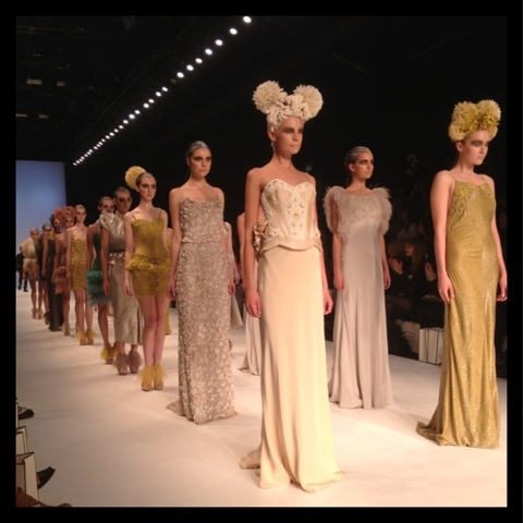 A lot of the dresses were absolutely beautiful however there was a few made in multiple colours and whilst one colour in the dress was amazing, the other colours were not as strong. One dress was like a 90's straight black silk dress with shoestring straps and beaded bust bodice, a little underdone in comparison to the other magnificent gowns that were waltzing the runway. Sometimes I feel it is best to show less dresses with each one being breathtaking rather than showing one dress style in multiple colours when one colour is so strong in comparison.
